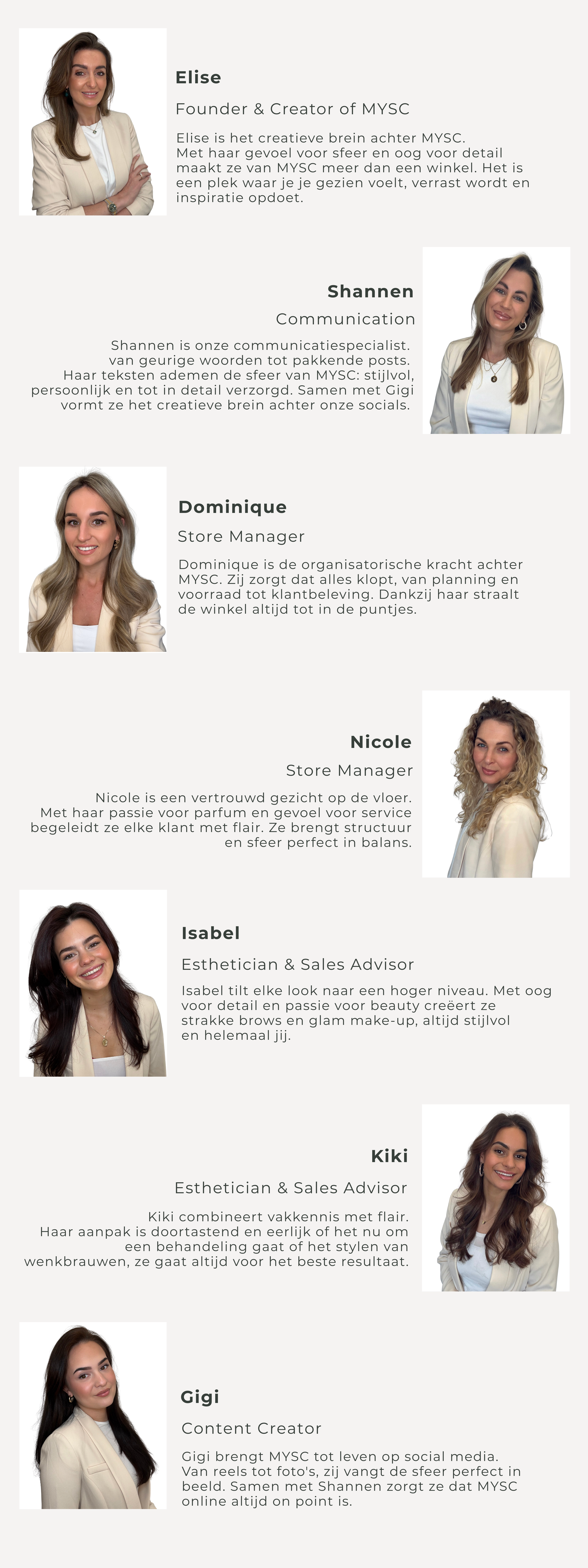 Maak kennis met het MYSC team! Bij MYSC Parfumerie staat de klant centraal. We werken binnen ons team dan ook intensief samen om ervoor te zorgen dat de klant blij en voldaan onze parfumerie en/of beautysalon verlaat. Geniet van persoonlijk advies van één van onze beauty advisors die ruim de tijd voor je nemen.